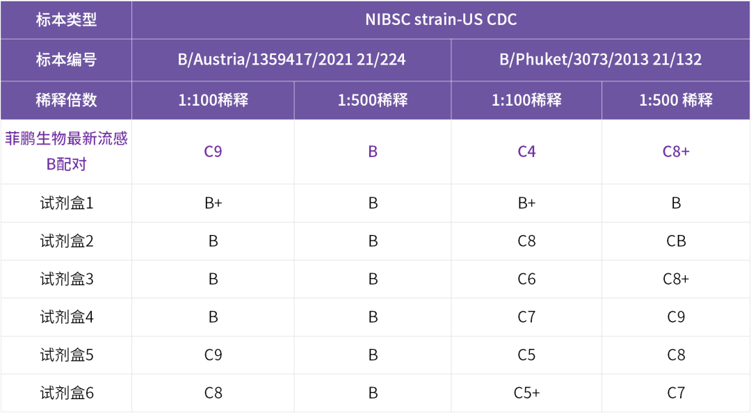 菲鵬生物流感B原料制備的試紙條與其他試劑盒對比數(shù)據(jù)