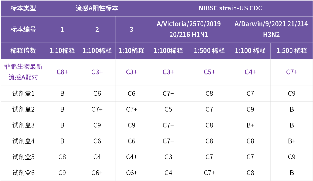 菲鵬生物為了保證抗體性能符合中游廠商的試劑要求,在流感聯(lián)檢模式下,對近期國內(nèi)流行的流感病毒以及美國CDC要求驗證毒株做重點測試: