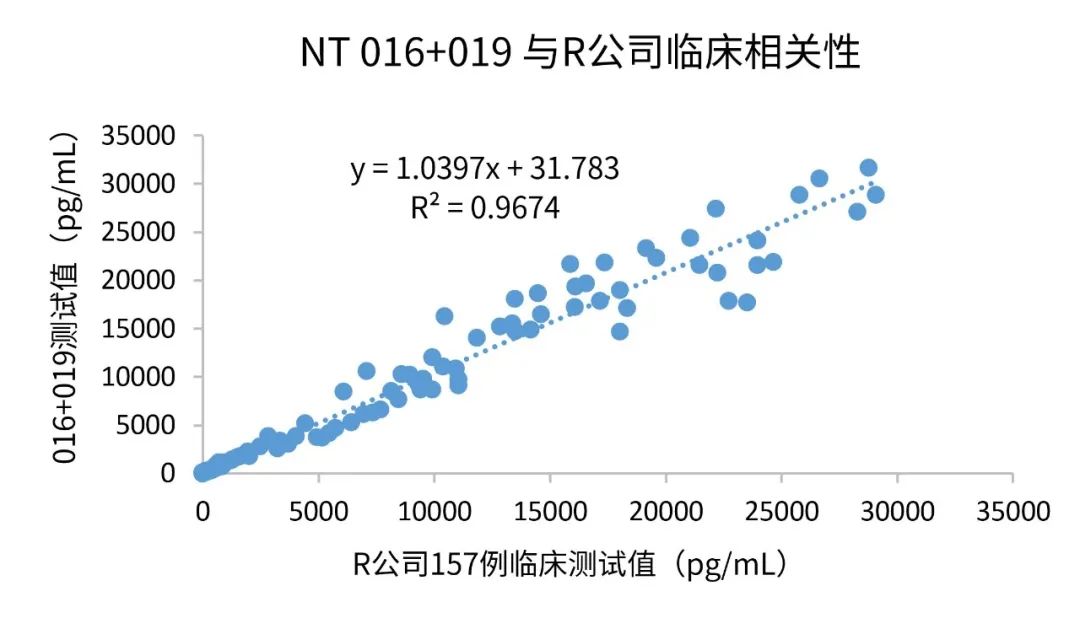 在免疫熒光平臺(tái)上,同R廠家進(jìn)行了157例臨床樣本比對(duì),臨床相關(guān)性R2≥0.96。