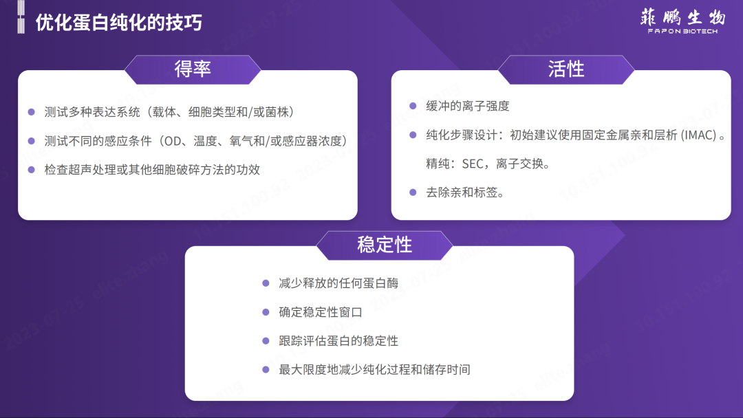在抗原開發(fā)過程中,蛋白質樣品的純度水平?jīng)Q定其對下游測試的影響,因此蛋白純度一般是原料廠商最關心的核心問題。而蛋白表達純化的得率、檢測中的活性和原料的穩(wěn)定性都與蛋白純度有著密切關系,因此對蛋白純化工藝的優(yōu)化可從以上三方面進行考慮。