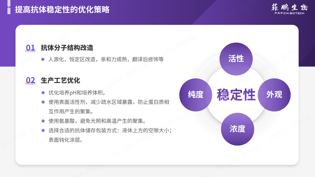 抗體的穩(wěn)定性品控可從濃度、純度、活性和外觀來考量。關于如何提高抗體的穩(wěn)定性,菲鵬生物建議從抗體工程和生產(chǎn)工藝優(yōu)化兩個方向進行優(yōu)化。