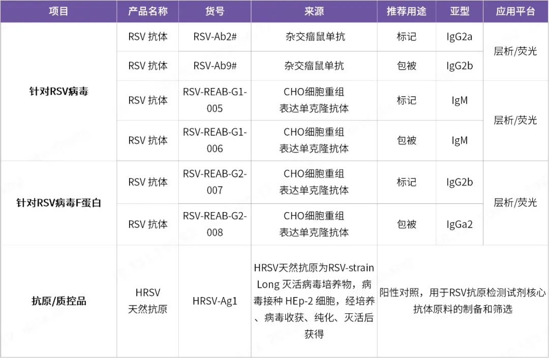 近期,菲鵬生物最新開發(fā)了針對(duì)RSV N蛋白、F蛋白的高質(zhì)量單克隆抗體,以及配合人呼吸道合胞病毒(Human respiratory syncytial virus,HRSV)的天然抗原質(zhì)控品,以期為IVD試劑伙伴加速開發(fā)優(yōu)質(zhì)的RSV診斷試劑盒保駕護(hù)航。